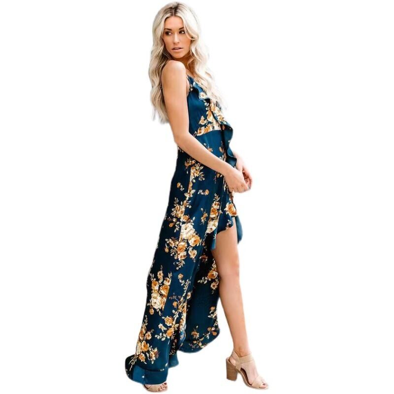 ヨーロッパとアメリカンスタイルのストリートファッションの女性の夏のサテンスプリットフローラルの新しいドレスセクシーなノースリーブVネックミッドウエスト サマー 夏物 花柄 ヨーロピアン 6733027079621578