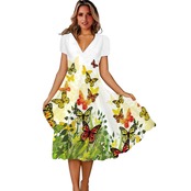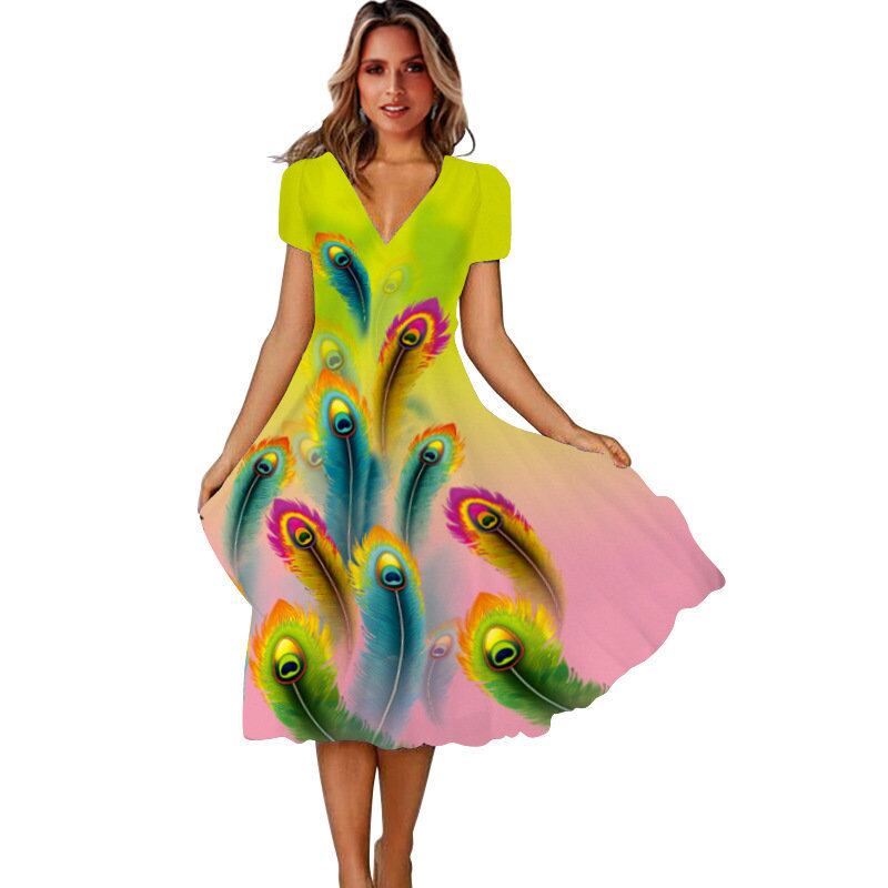 ヨーロピアンスタイルとアメリカンスタイルのストリートクロスボーダーの新しい女性用Vネックプラスサイズ半袖プリントロングドレスポジショニングプリントラージスイングドレス 大きめサイズ 6733067262482933