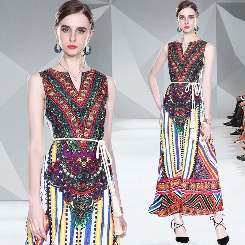 アマゾンAliExpressヨーロッパとアメリカンスタイルのストリートファッション新しい気質Vネックネクタイプリントノースリーブドレス ヨーロピアン 6733046293103321