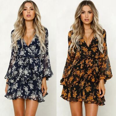ebayAliExpressはヨーロッパとアメリカのスタイルの夏の女性の長袖プリントローカットVネックストラップドレスの女性を望みます ロング サマー 夏物 ヨーロピアン 6733035235761797