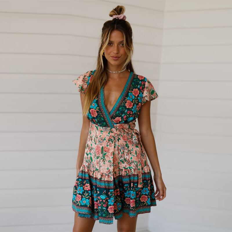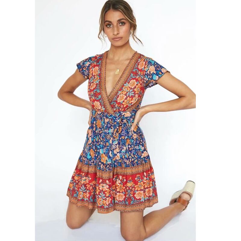 ヨーロッパとアメリカンスタイルの夏の新しいコットンシルクフリルポジショニングプリントVネックボヘミアンビーチドレス サマー 夏物 ヨーロピアン 6733088591601177