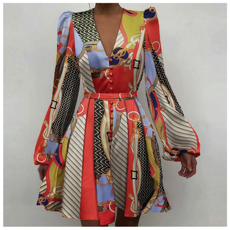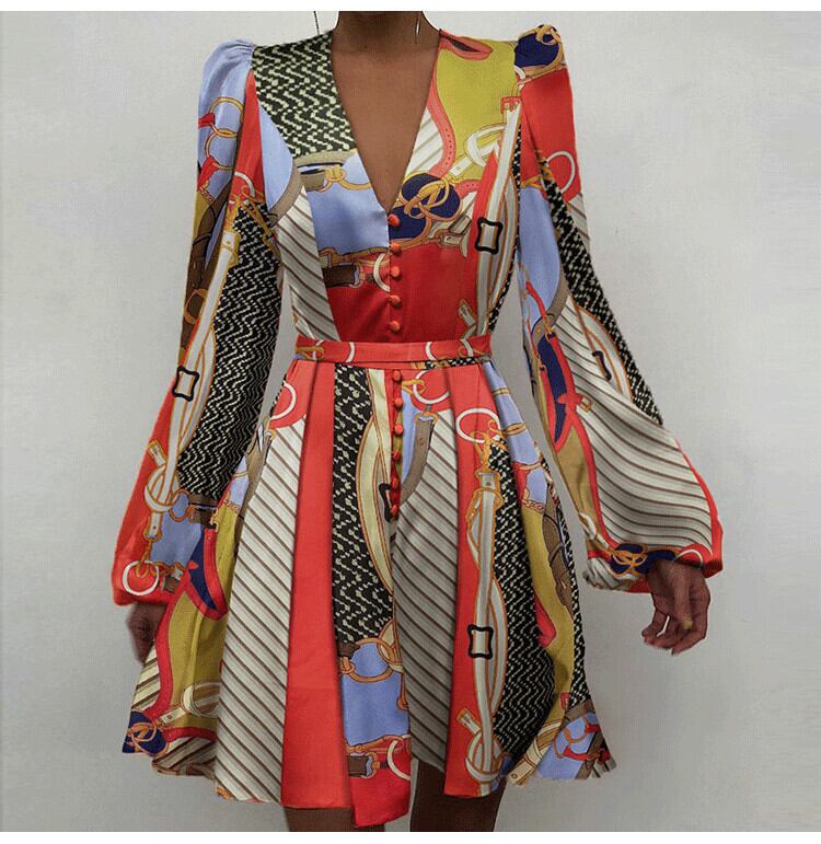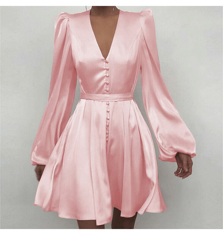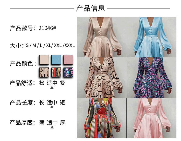 Aラインスカートヨーロッパとアメリカのフランスのプリンセススタイルのサテン気質パフスリーブ花柄ウエストディープV長袖ドレス ロング ヨーロピアン 6733031911565003