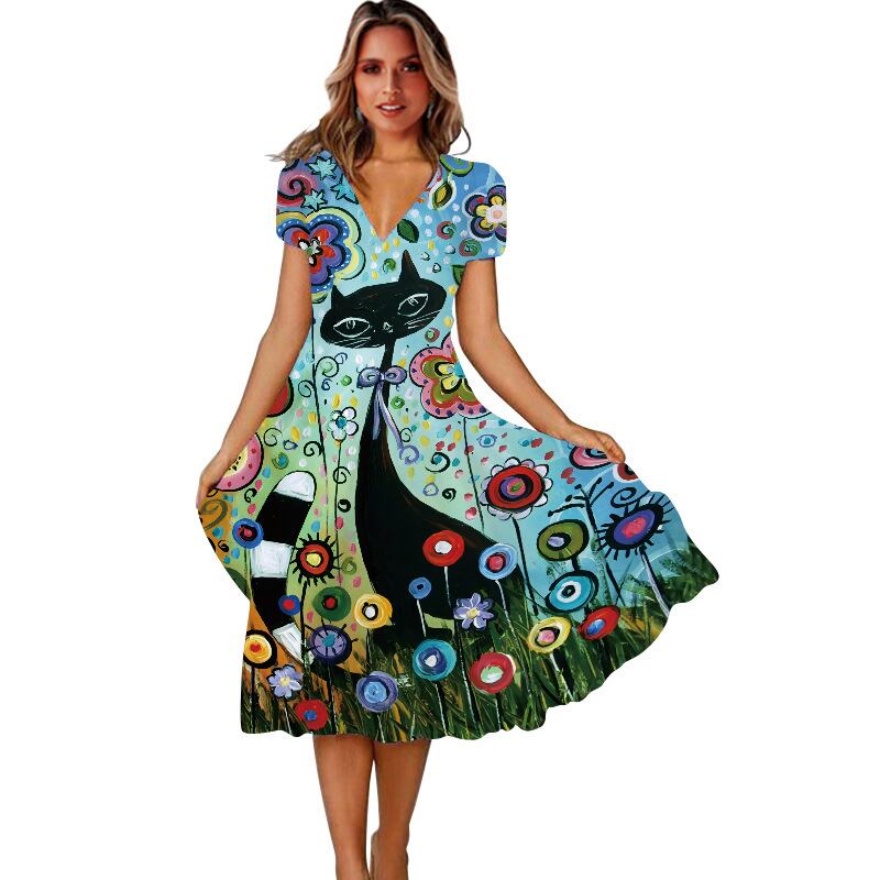 ヨーロッパとアメリカの国境を越えた新しいストリートウィメンズVネックプラスサイズ半袖プリントロングスカートポジショニングプリントラージスイングドレス 大きめサイズ ヨーロピアン 6733045159197252