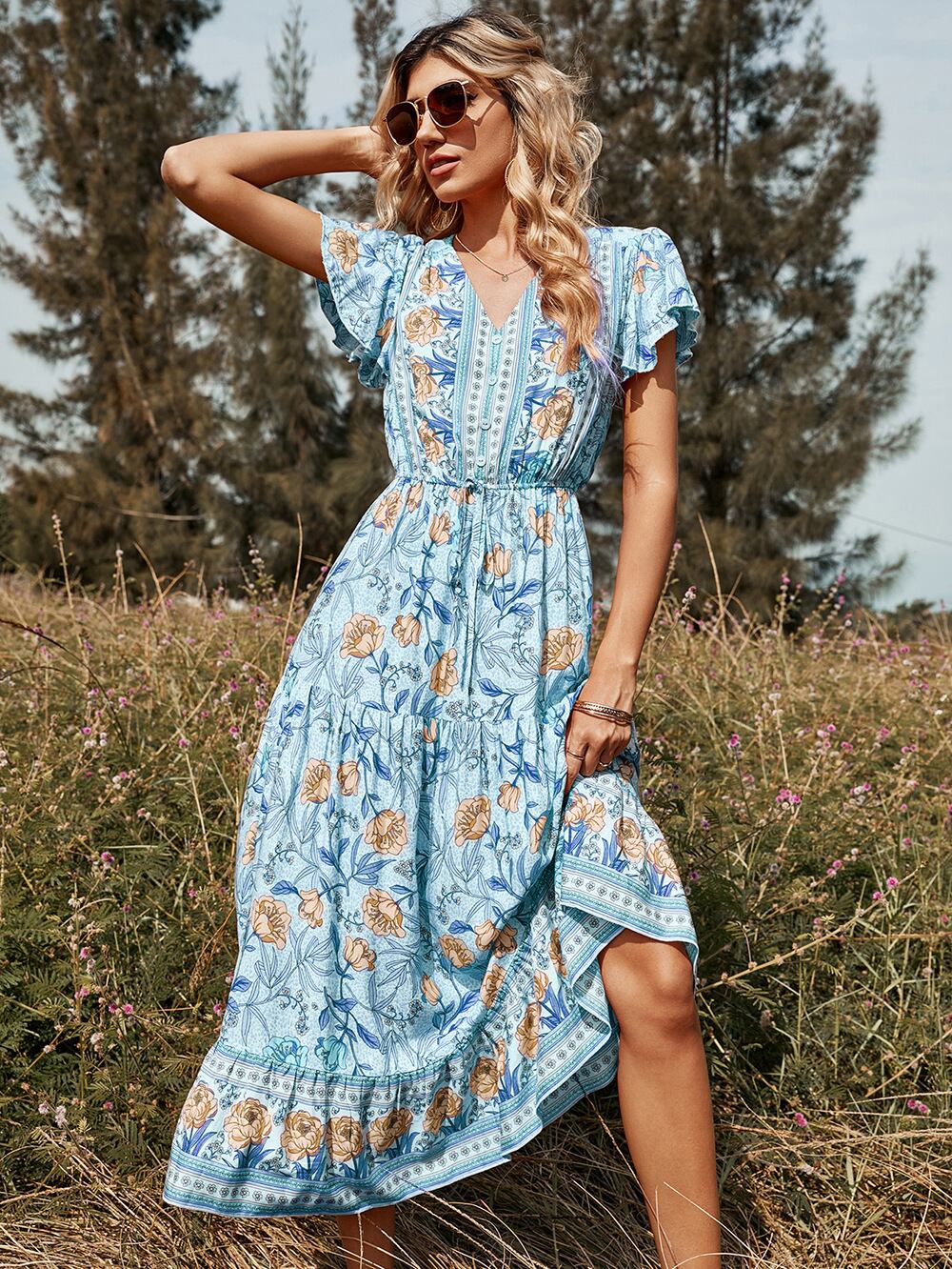 ヨーロッパとアメリカのストリートハイウエスト春と夏の新しい蓮の葉半袖Vネックストラップピンクプリントミドル丈レディースドレス ハイウェスト スプリング 春物 サマー 夏物 ヨーロピアン 6733017376765457