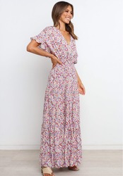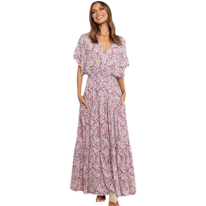 独立局アマゾン欧米フリルバットスリーブウエスト大スイングレディースワンピースVネックプリントケーキスカート 6733089088623856