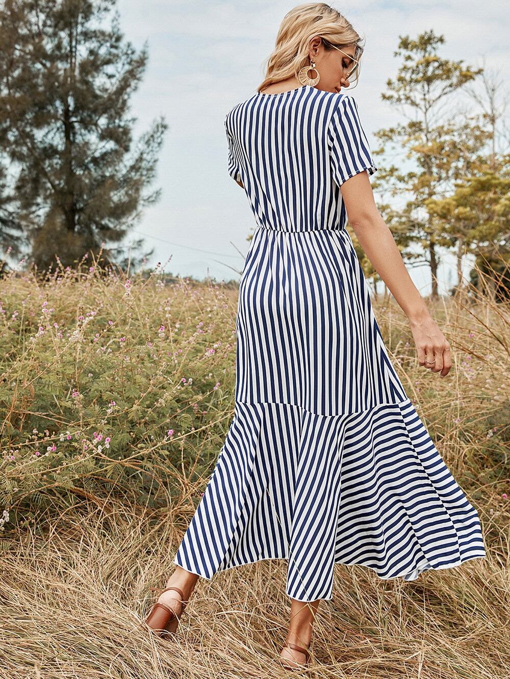 ヨーロッパとアメリカンスタイルのストリート春と夏の新しいVネックハイウエストプルオーバーネイビーブルーシングルブレスト半袖ストライプドレス女性 スプリング 春物 サマー 夏物 ヨーロピアン 6733081395542492