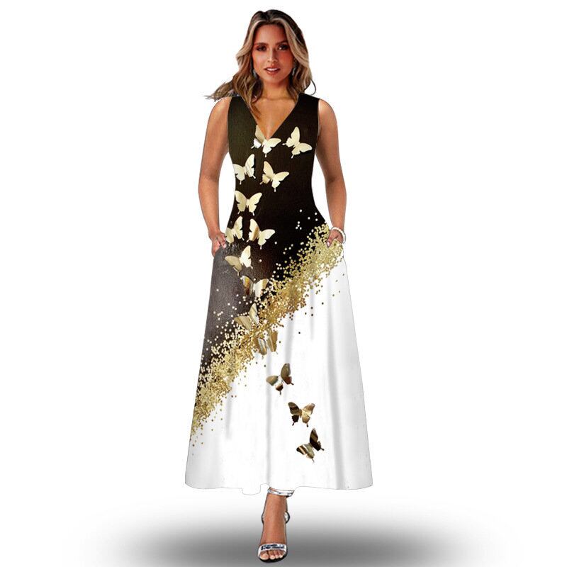ヨーロッパとアメリカのスタイルストリートニューサマーレディースノースリーブロングスカートVネックプリントレトロドレスヨーロッパとアメリカの国境を越えた婦人服 夏物 ヨーロピアン 6733045145122159