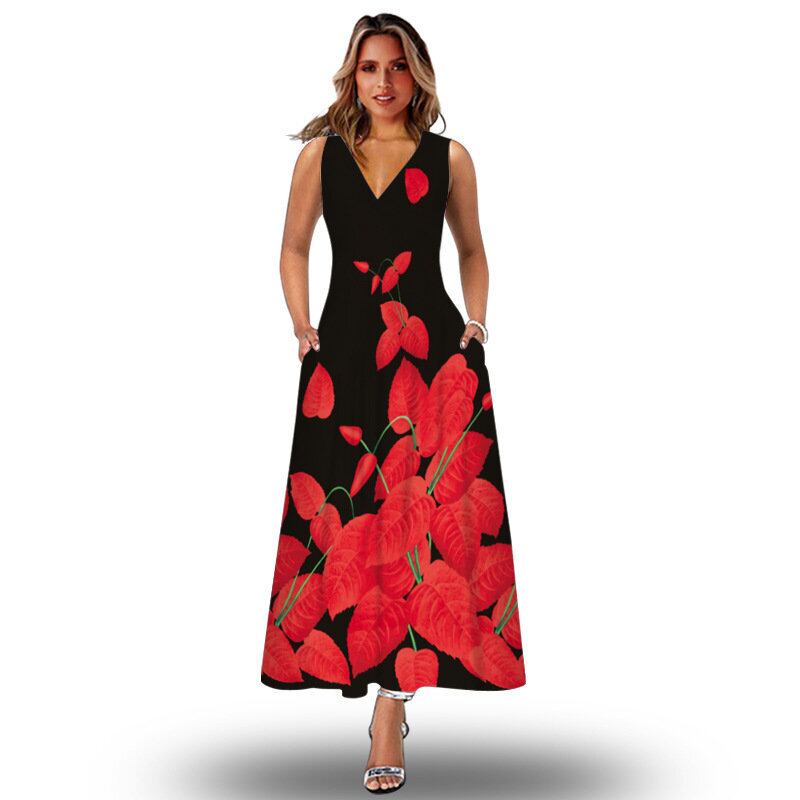2022年夏の独立局ヨーロッパとアメリカのレトロなプリントロングドレスVネックマルチカラーロングセクシーノースリーブドレス サマー 夏物 ヨーロピアン 6733063142254953