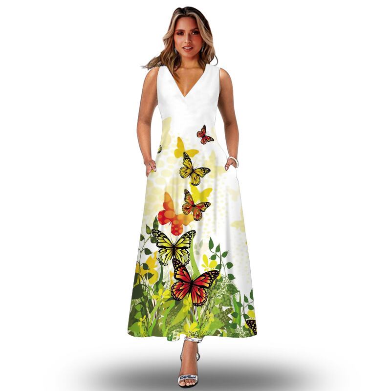 ストリートヨーロピアンとアメリカンスタイルのノースリーブドレスレディースカジュアルプリント大スイングスカートボヘミアンビーチルーズロングスカート 6733081971584999