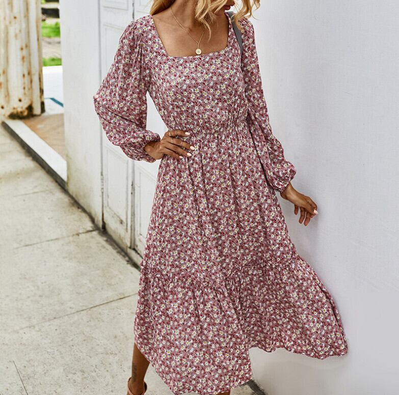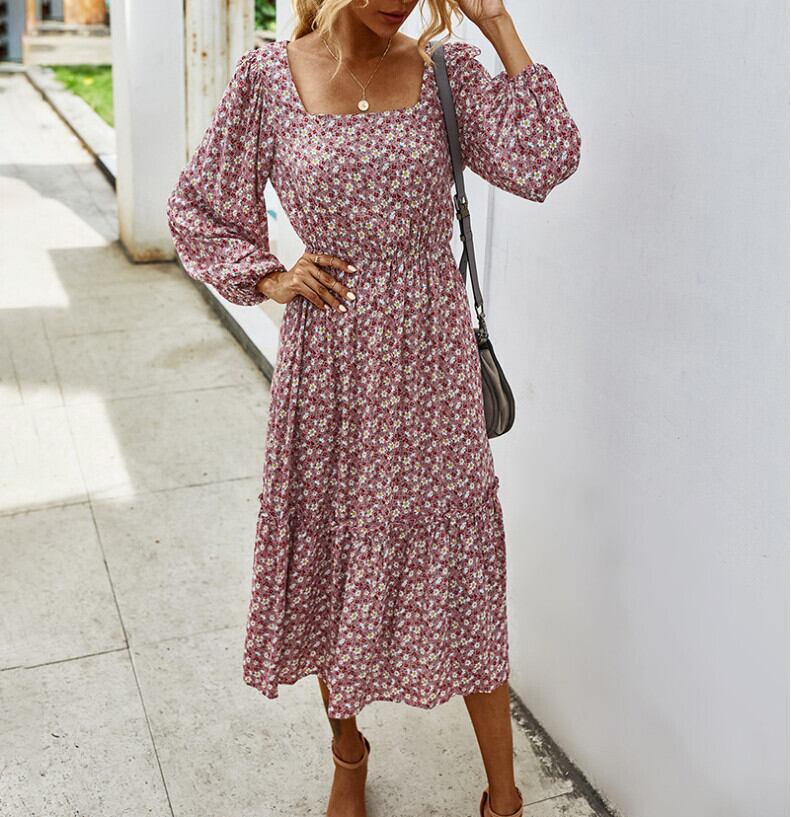 ヨーロッパとアメリカの甘いレトロなスクエアカラーロマンチックな花柄長袖ドレスサマーウエストシンカーディガンミドル丈Aラインスカート ロング 大人ガーリー スウィート キュート カジュアル 夏物 スクウェア ヨーロピアン 6733080977768795