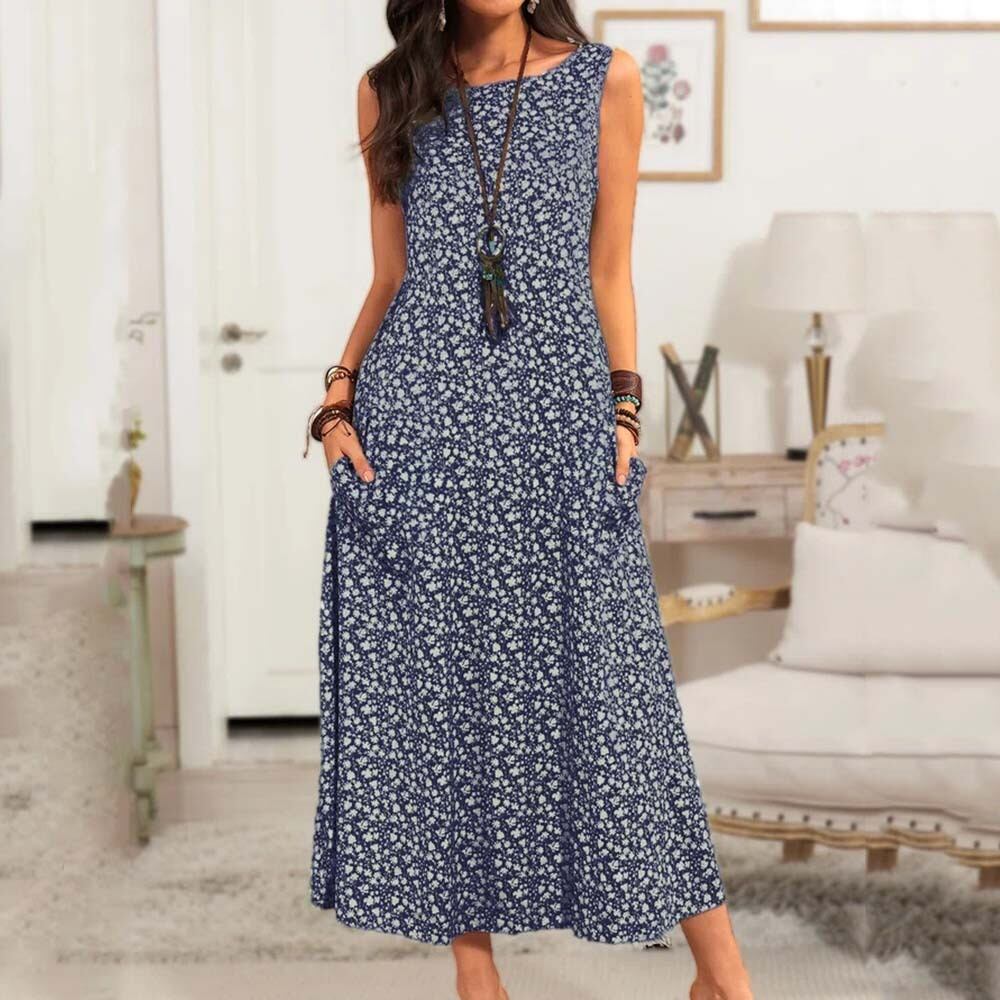春夏ファッションヨーロピアンアメリカンスタイルニューウィッシュアマゾンノースリーブフローラルプリントラウンドネックポケットドレスレディース スプリング 春物 サマー 夏物 花柄 Oネック 6733091675819175