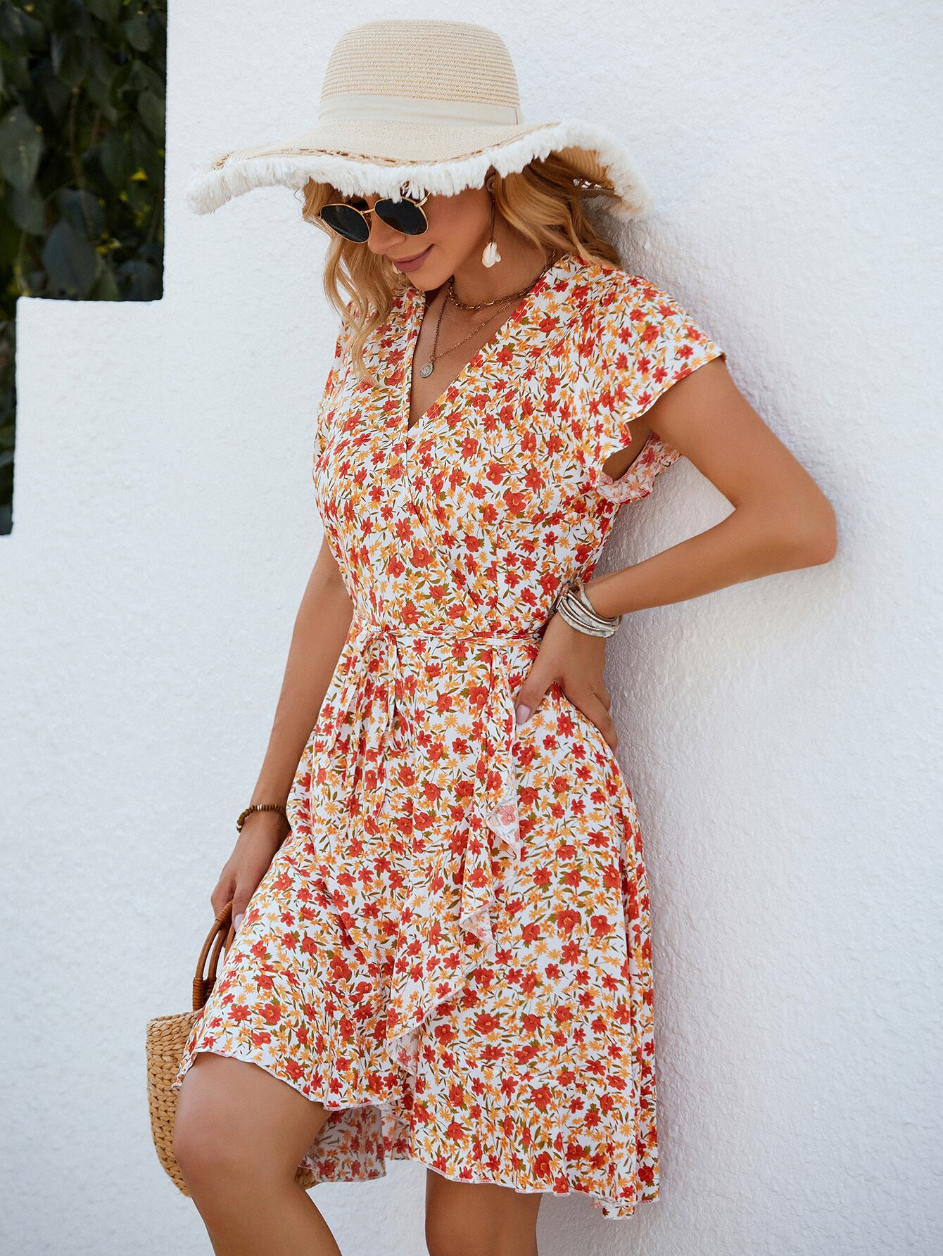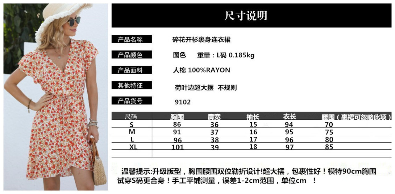 ヨーロッパとアメリカンスタイルのストリートファッションレーヨンプリントの新しい不規則なフリル半袖カーディガンレースアップドレスの女性 ヨーロピアン 6733022484310938
