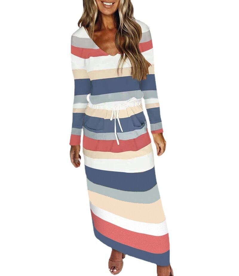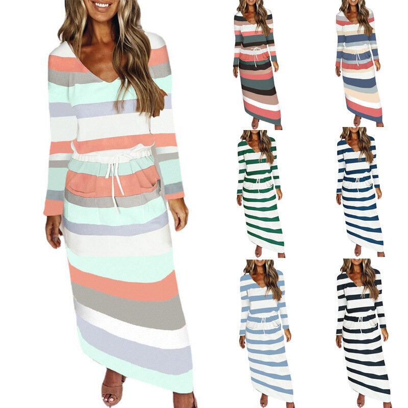 ヨーロッパとアメリカンスタイルのファッションは、新しい秋と冬の婦人服カジュアルVネックルーズストライププリント長袖ドレストレンディを願っています ロング オータム 秋物 ウィンター 冬物 ヨーロピアン 6733025490819152