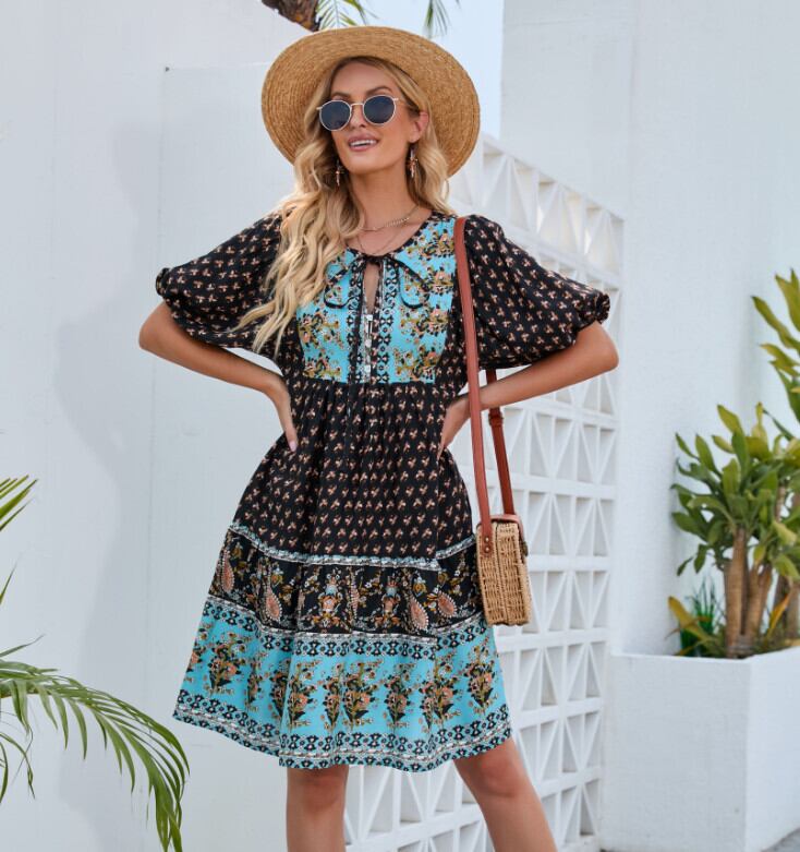 サマーファッションヨーロピアン・アメリカンスタイルストリート新作オリジナルデザインVネック半袖大スイングホリデースタイルワンピースカラー半袖 夏物 6733047436536946