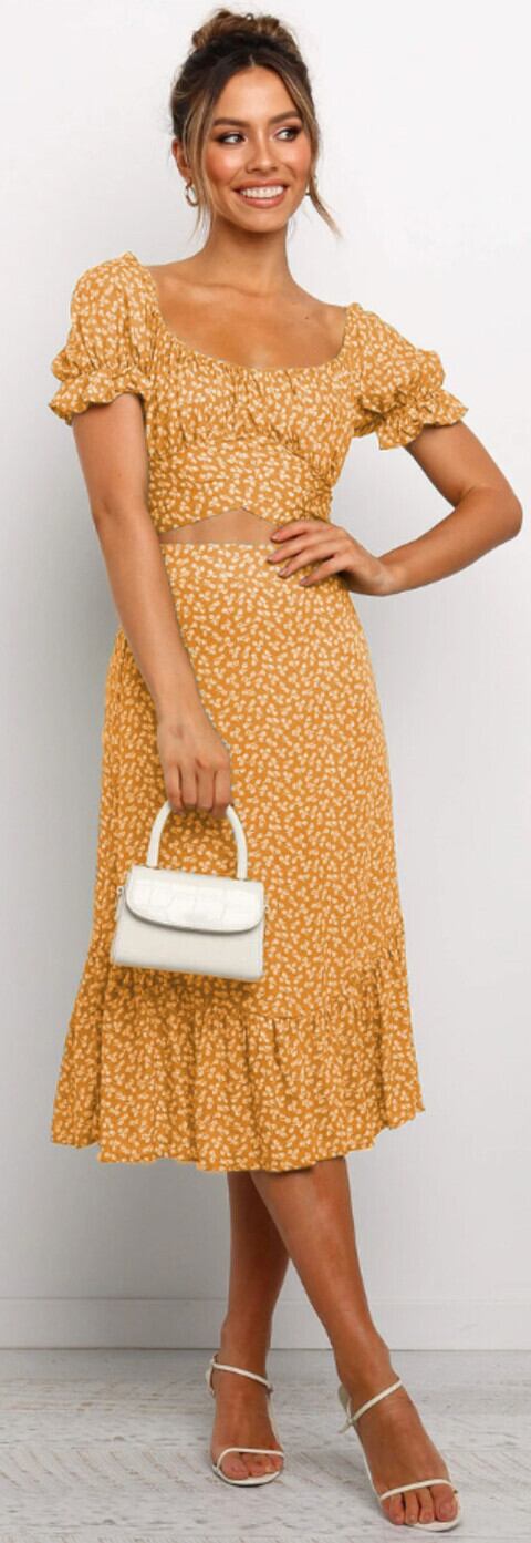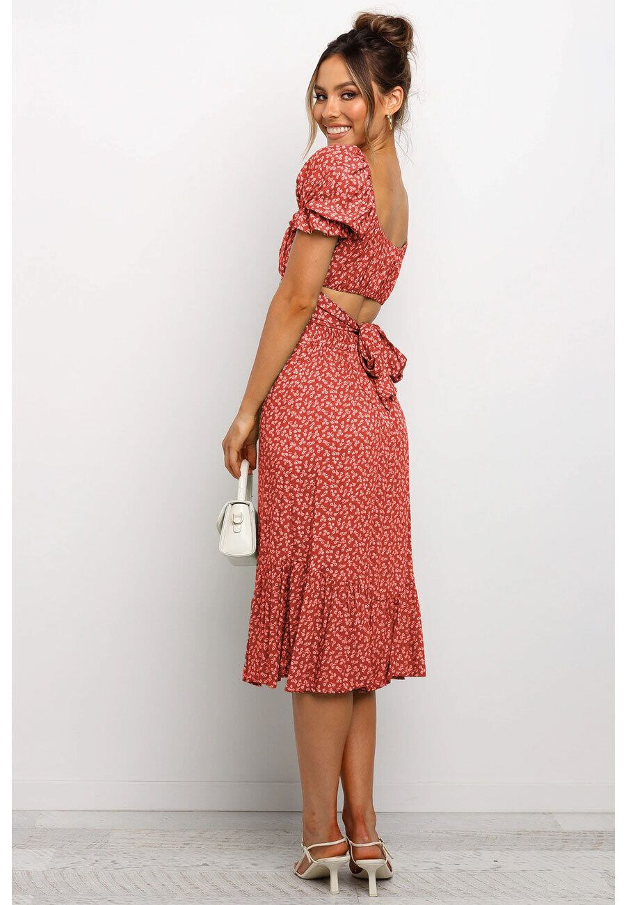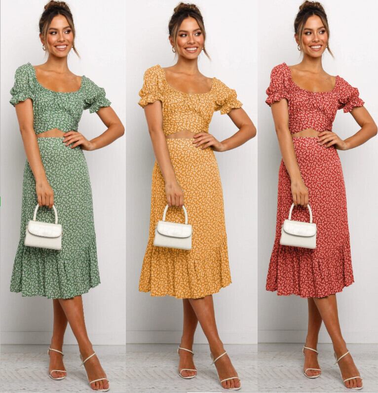 アマゾンサマーファッションニュープリントラウンドネックセクシーストラップウエストパフスリーブスモールフローラルドレススーツ 夏物 花柄 Oネック 6733076006169139