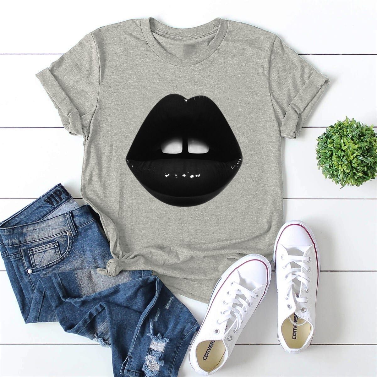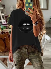 アマゾンの新しいAliExpressヨーロッパとアメリカの半袖Tシャツブラックリッププリントラージサイズの女性のラウンドネックウエストトップ 大きめサイズ Oネック ヨーロピアン 6733062674964099