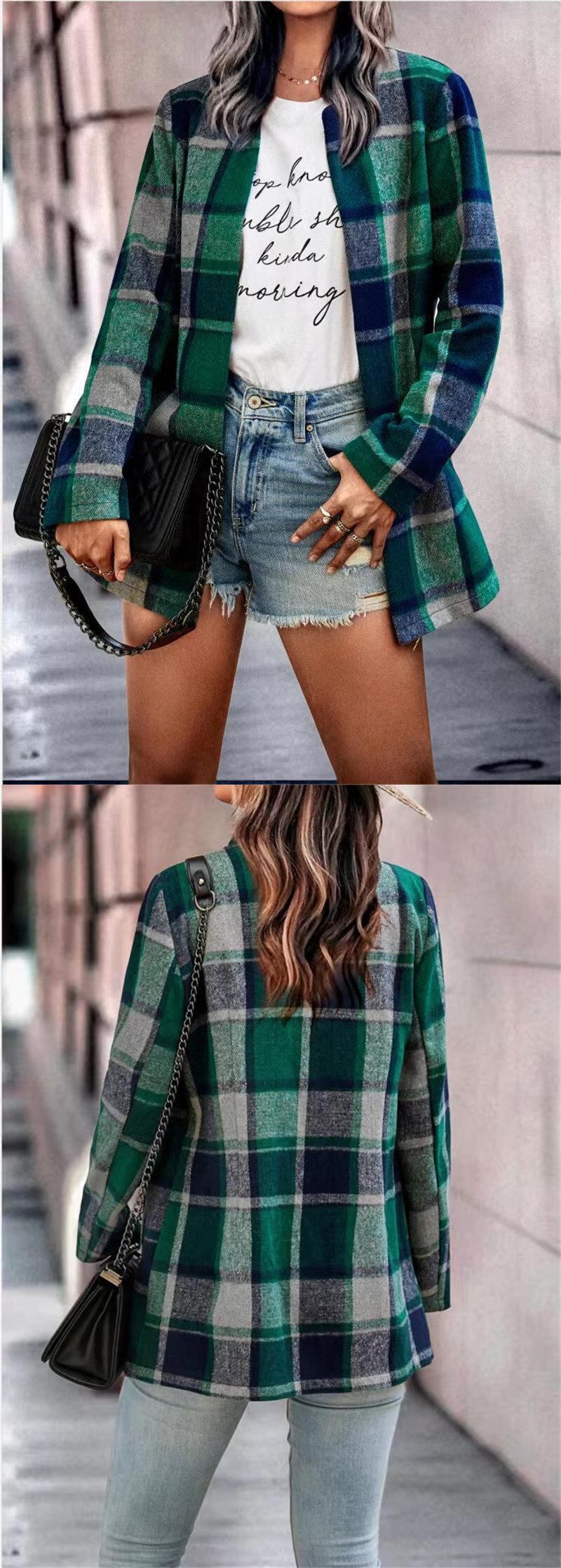 秋と冬のファッションの気質ヨーロッパとアメリカのクロスボーダーの女性のゆるい格子縞のプリント長袖ポケットウールコートカーディガントップ ロング オータム 秋物 ウィンター 冬物 ヨーロピアン 6733087338140742